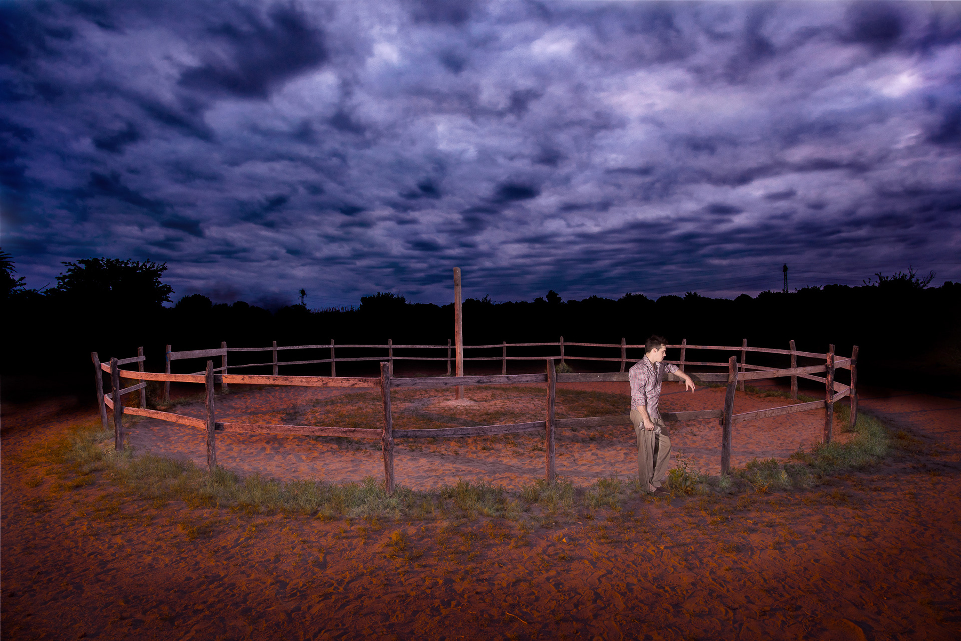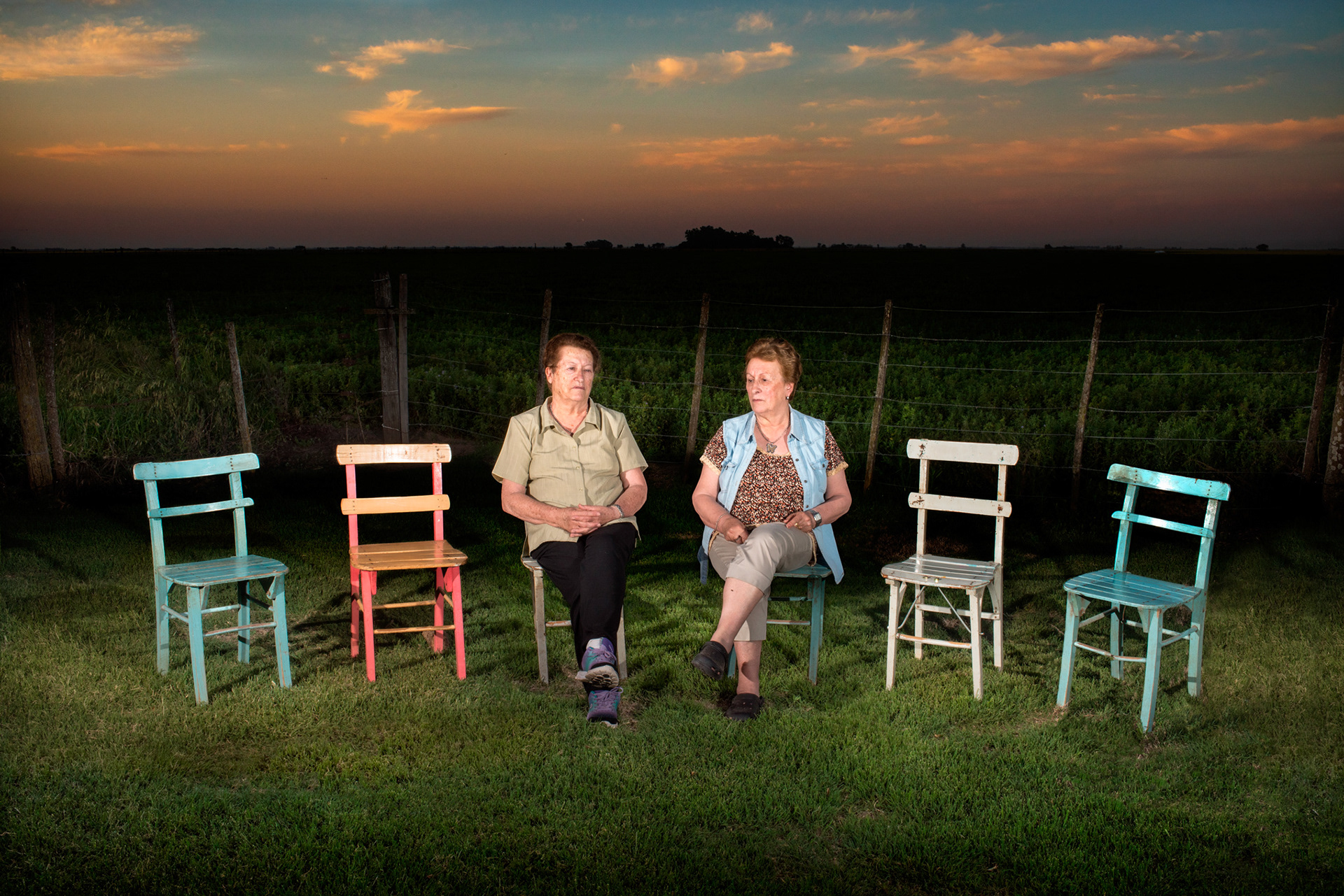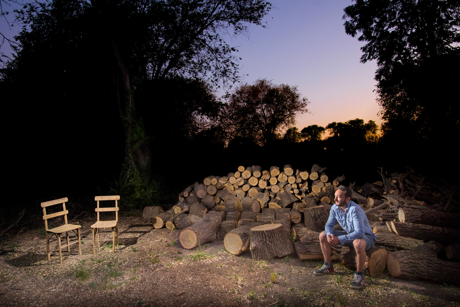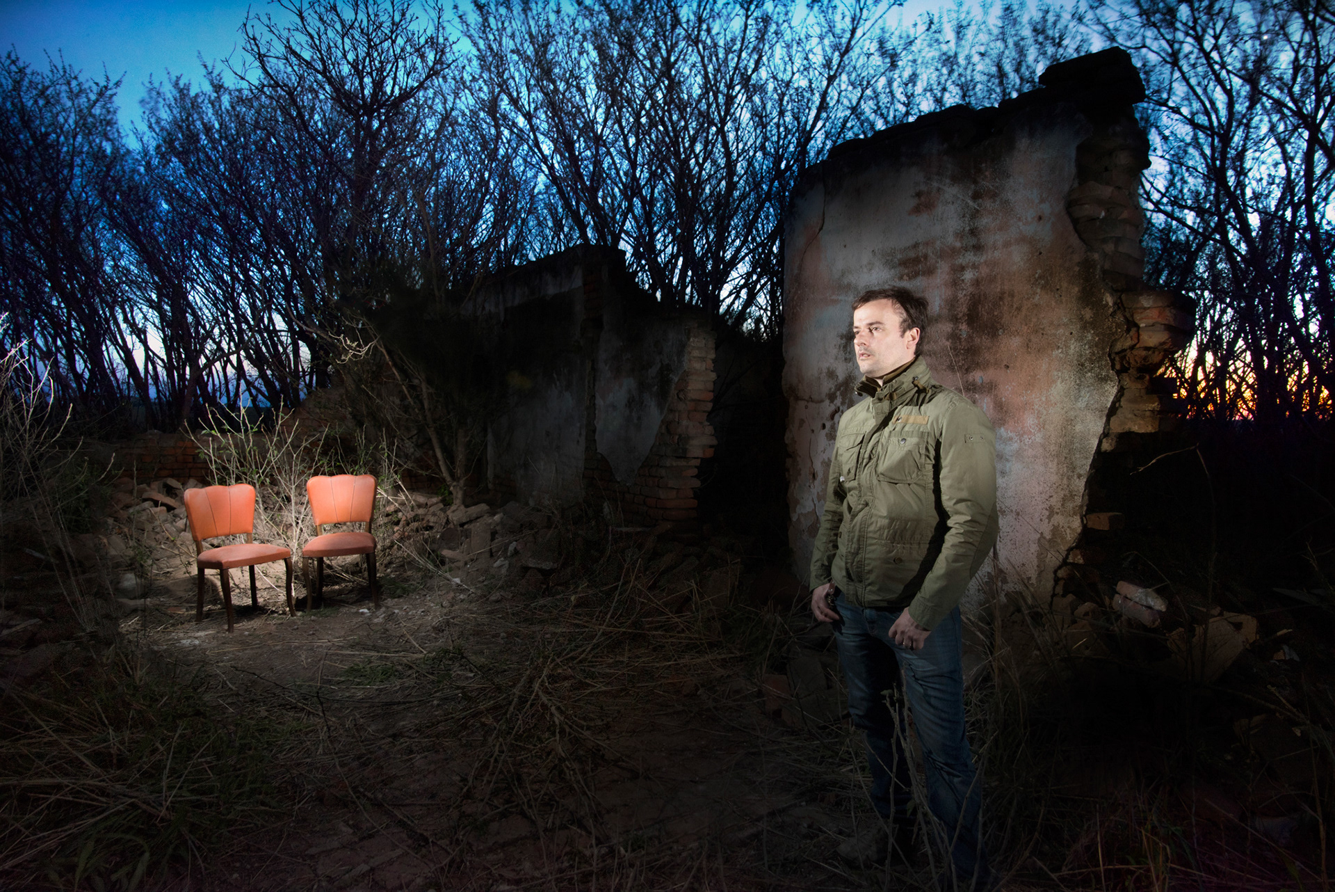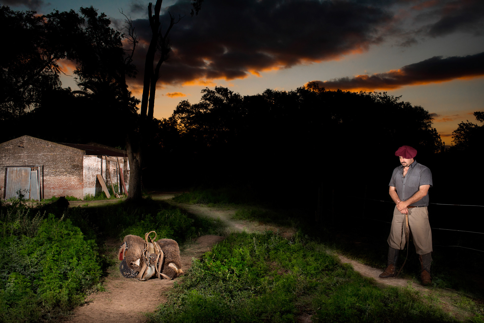 Partiendo del dialogo con el retratado, este, propone una ausencia y el modo de representarla. Lo que permanece invariable es la hora elegida: El atardecer. Optamos por este entrecruzamiento o indeterminación entre el día y la noche como metáfora de esas ausencias que son constantes presencias. Y por ser el atardecer la puerta de entrada a la oscuridad de la noche, ámbito propicio para el florecer de recuerdos, nostalgias y anhelos. También permanecen invariables los entornos naturales con agregado de iluminaciones artificiales, obteniendo así escenarios sobrenaturales.